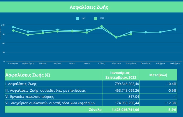 Ειδικότερα τα ασφαλιστήρια ζωής μειώθηκαν κατά 10,4% και οι ασφαλίσεις ζωής κατά 0,9%. Σε αυτό το πεδίο άνοδο καταγράφει η διαχείριση συλλογικών συνταξιοδοτικών κεφαλαίων κατά 12,3%.