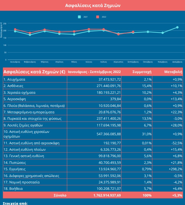 Με αύξηση 5,3% κινήθηκαν οι γενικές ασφαλίσεις με τον κλάδο ασθενειών να αυξάνει την παραγωγή κατά 10,1% την περίοδο Ιανουάριος-Σεπτέμβριος 2022.