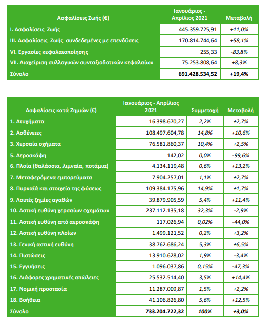 Με θετικό πρόσημο κινήθηκε η παραγωγή των ασφαλιστικών εταιρειών την περίοδο Ιανουαρίου – Απριλίου 2021.