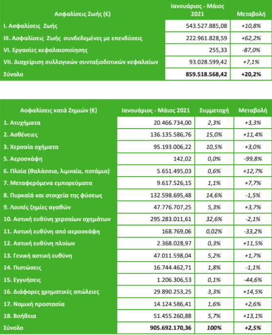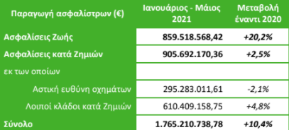 Αυξημένη κατά 10,4% είναι η ασφαλιστική παραγωγή στο πρώτο πεντάμηνο του 2021 σύμφωνα με τα στοιχεία της ΕΑΕΕ.