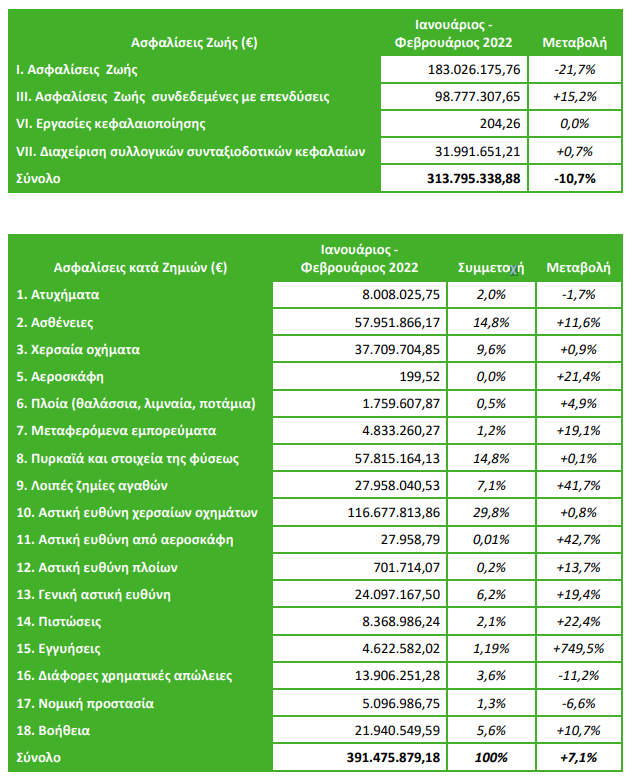 Αρνητικά κινήθηκε η ασφαλιστική παραγωγή στο πρώτο δίμηνο του έτους, χάνοντας συνολικά το 1,6% των ασφαλίστρων που είχε το 2021.