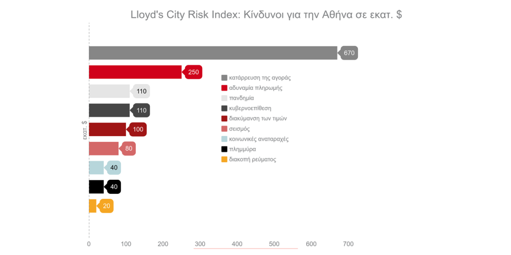 Όπως αποκαλύπτει η έρευνα των Lloyd’s αθροιστικά οι κίνδυνοι που μπορούν να εκδηλωθούν στην πόλη της Αθήνας μπορούν να φτάσουν το 1,48 δις ή το 1,53% του ΑΕΠ της Αθήνας και ο ασφαλισμένος κίνδυνος είναι εξαιρετικά μικρός.