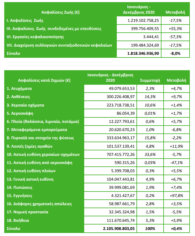 Σύμφωνα με τα στοιχεία της ΕΑΕΕ οι ασφαλίσεις ζωής σημείωσαν μεγάλη πτώση κατά 8% στο δωδεκάμηνο του προηγούμενου έτους και οι ασφαλίσεις κατά ζημιών σημείωσαν οριακά θετική πορεία με αύξηση 0,4%.
