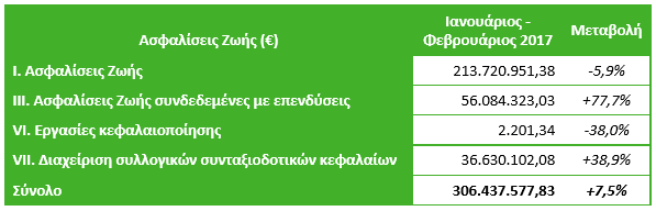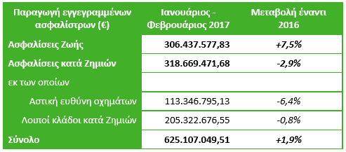 Τον Φεβρουάριο του 2017 σε σύγκριση με τον αντίστοιχο μήνα του 2016, οι ασφαλίσεις Ζωής αύξησαν την παραγωγή τους σε μηνιαία βάση για όγδοο συνεχόμενο μήνα φτάνοντας το +7.5%. Αντιθέτως, οι ασφαλίσεις κατά Ζημιών κατέγραψαν μείωση για πρώτη φορά μετά από έξι συνεχόμενους μήνες ανόδου με την παραγωγή να είναι μειωμένη κατά 2.9%.