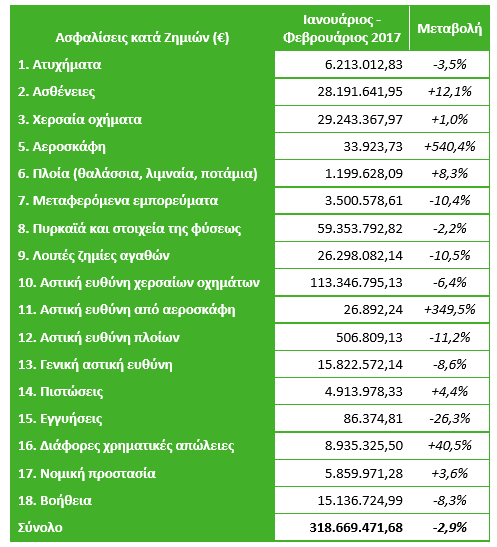 Συνολικά, η παραγωγή ασφαλίστρων μηνός Φεβρουαρίου μειώθηκε κατά 5,6%, έναντι του Φεβρουαρίου του 2016.