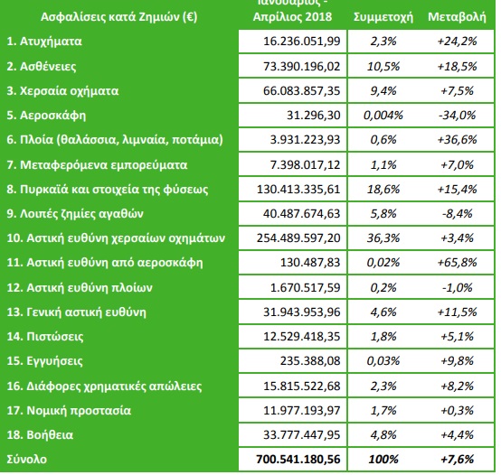 Κατά 7,4% αυξήθηκαν οι ασφαλίσεις ζημιών στο πρώτο τετράμηνο του 2018, συνεχίζοντας και τον Απρίλιο να σημειώνουν ανοδική πορεία που έφτασε το 2,4%. Σύμφωνα με τα στοιχεία που δημοσίευσε η ΕΑΕΕ ο κλάδος κινήθηκε θετικά λόγω της μεγάλης αύξησης στα χερσαία οχήματα (+7,5%), τις ασθένεις (+18,5%),τις καλύψεις πυρός (+15,4%) και την αστική ευθύνη χερσαίων οχημάτων (+3,4%).