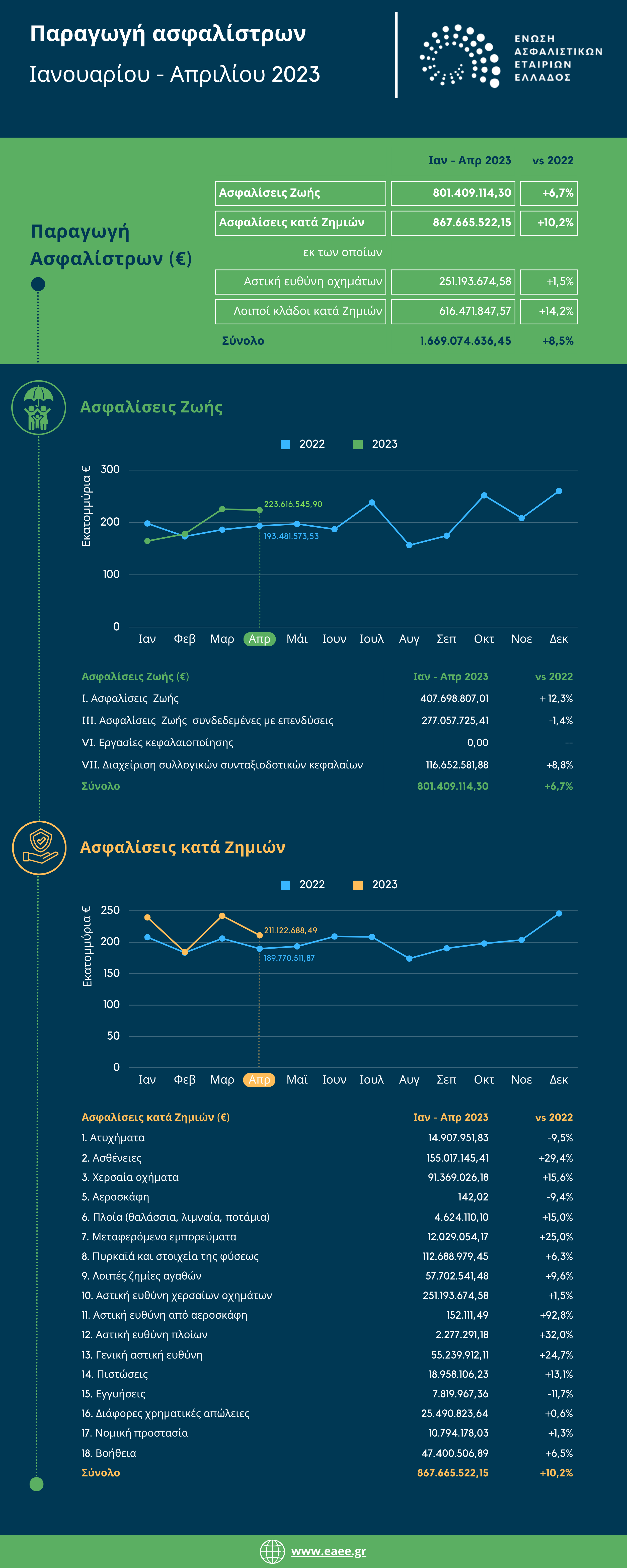 Στους κλάδους ζωής η αύξηση αποδίδεται κατά κύριο λόγο στα συμβόλαια ζωής που αποτελούν το μισό της παραγωγής και αυξήθηκαν κατά 12,3%, ενώ θετικά κινήθηκαν και τα προγράμματα με συλλογικά συνταξιοδοτικά κεφάλαια. Αντίθετα, μείωση 1,4% σημείωσαν οι ασφαλίσεις που είναι συνδεδεμένες με επενδύσεις.