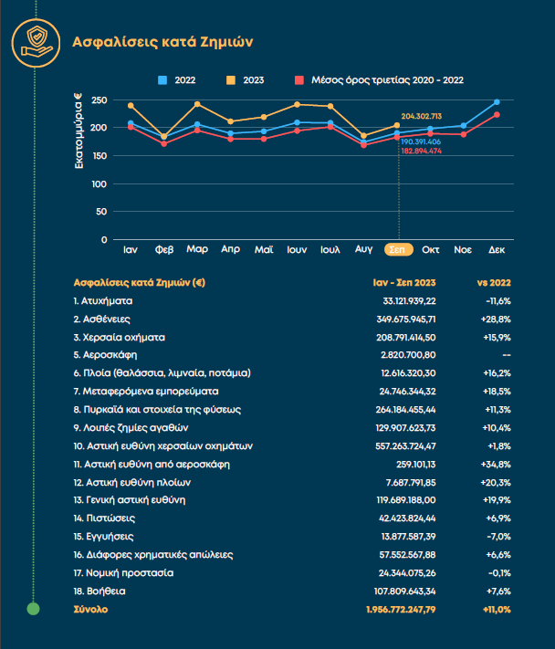 Γενικότερα η συνολική παραγωγή είναι στο +9,7% και ανέρχεται σε 3,8 δις μέχρι και το Σεπτέμβριο. Μεγάλη αύξηση καταγράφεται στις ασφαλίσεις υγείας που είναι στο +28,8%, στα χερσαία οχήματα που είναι +15,9% και στους κλάδους γενικής αστικής ευθύνης όπου η παραγωγή έχει κινηθεί ανοδικά κατά 19,9%.