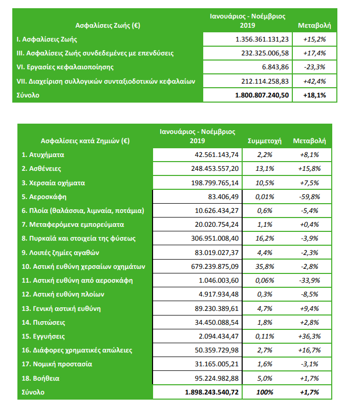 Με εξαιρετικά θετικά πρόσημο που έφτασε το 9,1% κινήθηκε η ασφαλιστική αγορά στο ενδεκάμηνο του 2019. Συνολικά η παραγωγή ανήλθε σε 3,69 δις ευρώ, με το 1,8 δις να αφορά στους κλάδους ζωής και το 1,8 στις γενικές ασφαλίσεις.