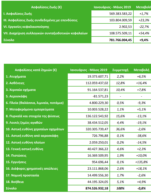 Αυξημένες κατά 9,4% είναι σύμφωνα με τα στοιχεία της ΕΑΕΕ οι ασφαλίσεις ζωής στο πρώτο πεντάμηνο του 2019. Ειδικότερα μεγάλη αύξηση παρουσιάζει η διαχείριση συλλογικών συνταξιοδοτικών κεφαλαίων (+54,4%) και οι ασφαλίσεις που συνδέονται με επενδύσεις (+23,3%), ενώ οι ασφαλίσεις ζωής που γράφουν 569,3 εκατ. ευρώ από τα 781,7 εκατ. του κλάδου συνολικά σημείωσε αύξηση της τάξεως του 1,7%.
