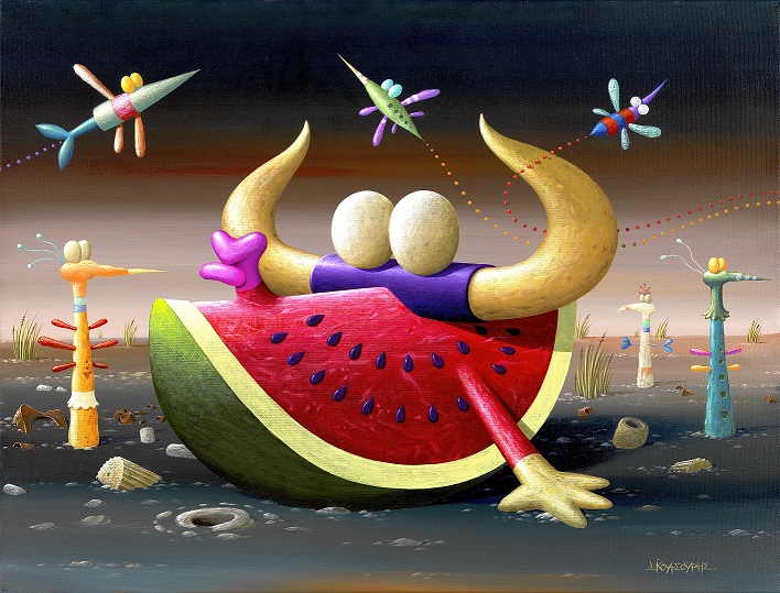 Οι έντονοι χρωματισμοί, οι υπερβολικές διστάσεις και τα εξωπραγματικά φόντα συμπυκνώνουν τους προβληματισμούς του για το σύγχρονο τρόπο ζωής, ενώ η άρτια χρήση των ακρυλικών χρωμάτων αναδεικνύει τα πηγαία εκφραστικά του μέσα.