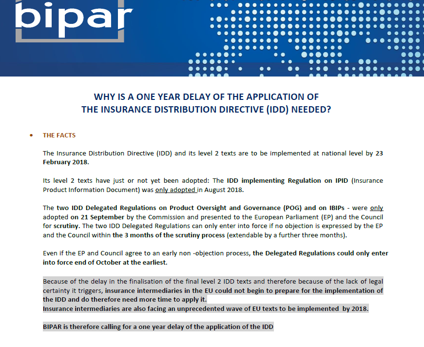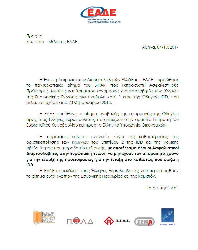 Να προχωρήσει στην αναβολή της IDD για ένα έτος προκειμένου να υπάρξει το κατάλληλο χρονικό διάστημα προετοιμασίας της διαμεσολάβησης ζητά και η ΕΑΔΕ, προωθώντας το αίτημα της BIPAR στους Έλληνες Ευρωβουλευτές. Στην επιστολή που ακολουθεί η ΕΑΔΕ ενημερώνει σχετικά με την ενέργεια της αυτή τα μέλη της: