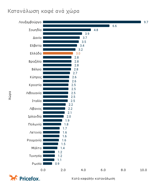 Οι Έλληνες μπαίνουν στην κορυφαία δεκάδα με 3 κιλά καφέ κατά κεφαλήν ετήσια κατανάλωση. Ενώ η Ιταλία που είναι γνωστή για την εκλεπτυσμένη κουλτούρα της στον καφέ βρίσκεται στην 21η θέση στην κατάταξη με μόλις 2,5 κιλά καφέ κατα κεφαλήν.