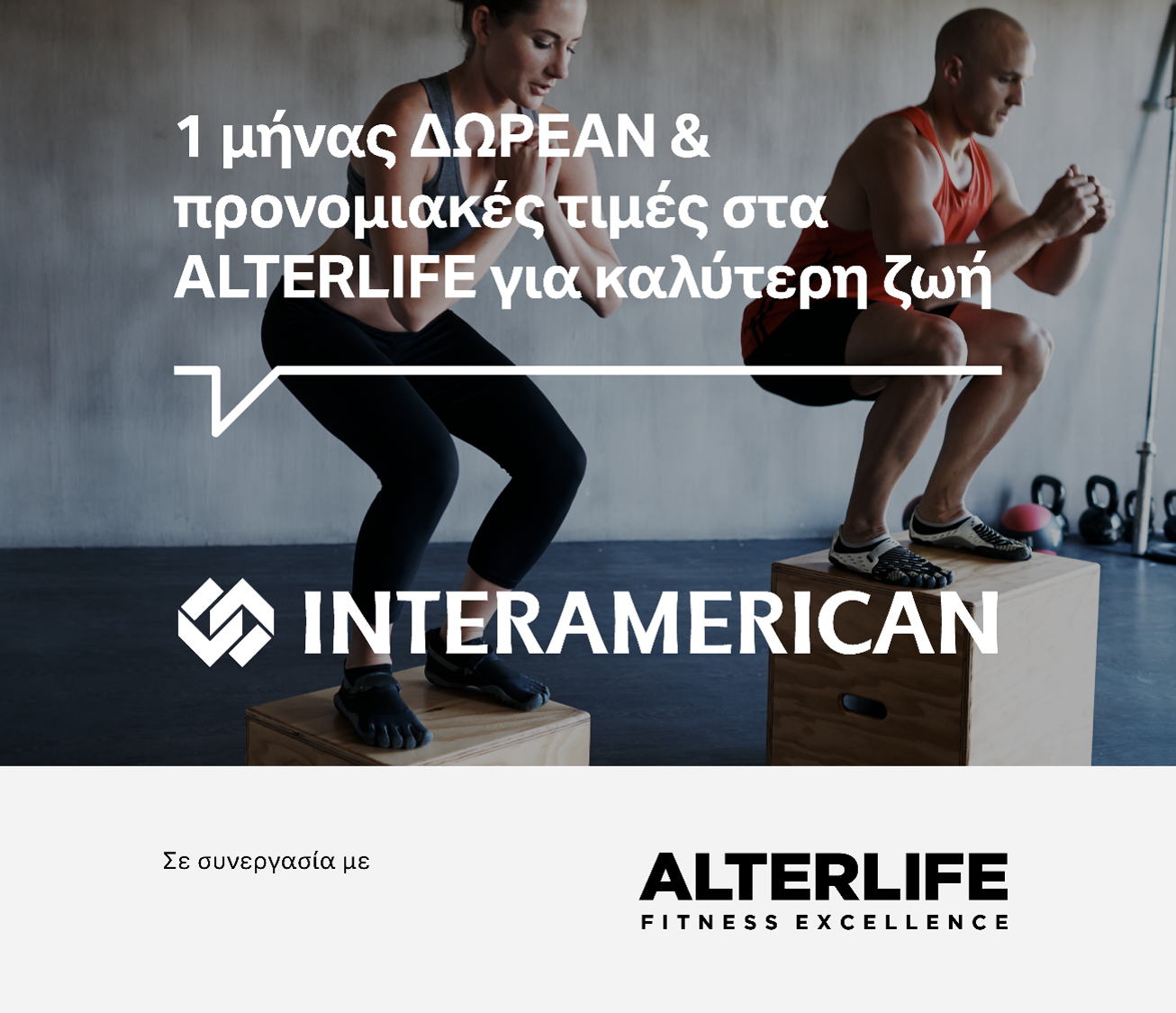 Αντίστοιχα, ο Τηλέμαχος Κουκουφλής, Γενικός Διευθυντής της ALTERLIFE, δήλωσε: «Στην ALTERLIFE είμαστε στην εξαιρετικά ευχάριστη θέση να ανακοινώσουμε τη συνεργασία μας με την Interamerican, την εταιρεία που κατέχει κορυφαία θέση στην ασφαλιστική αγορά. Η αποστολή της Interamerican να βοηθά τους ανθρώπους να ζουν ασφαλέστερα, περισσότερο και καλύτερα, συνάδει απόλυτα με αυτή της ALTERLIFE, που είναι να ενσωματώσει στην καθημερινότητα των ανθρώπων την σωματική άσκηση και τα ευεργετικά της οφέλη, μεγιστοποιώντας έτσι το ποσοστό όσων ασχολούνται συνειδητά με οποιαδήποτε μορφή γυμναστικής. Ενώνουμε τις δυνάμεις μας για να αλλάξουμε τις ζωές των συμπολιτών μας!».