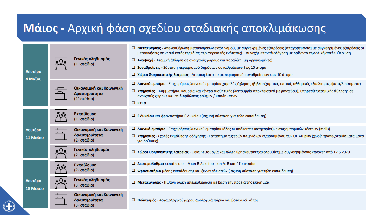 - 4 Μαΐου: Θα ανοίξουν οι εταιρείες λιανικού εμπορίου και παροχής υπηρεσιών (βιβλιοπωλεία, οπτικά, υποδημάτων, αθλητικός εξοπλισμός, φυτών, κομμωτήρια, κέντρα αισθητικής και ΚΤΕΟ).