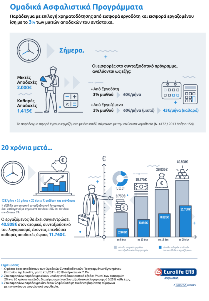 Πώς λειτουργεί όμως ένα ομαδικό συνταξιοδοτικό πρόγραμμα. Δες ένα ενδεικτικό παράδειγμα στο παρακάτω infographic: