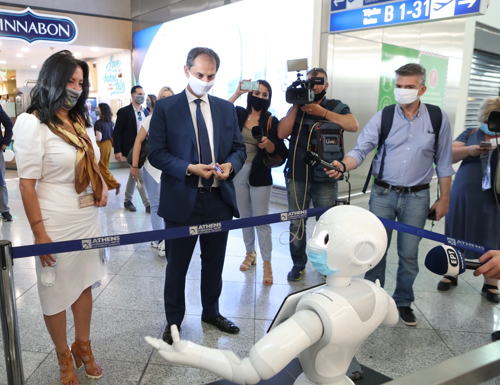 Με το μήνυμα “Προτεραιότητά μας η υγεία σας” το μεγαλύτερο αεροδρόμιο της χώρας επιστράτευσε τα δημοφιλή ρομπότ, Pepper, που ήδη είχε στη διάθεσή του, αξιοποιώντας το χιούμορ και την αμεσότητά τους, για να ενημερώνουν (σε Ελληνικά και Αγγλικά) με το δικό τους ξεχωριστό τρόπο τους ταξιδιώτες που άρχισαν πάλι σταδιακά να επιστρέφουν από τις 15 Ιουνίου.