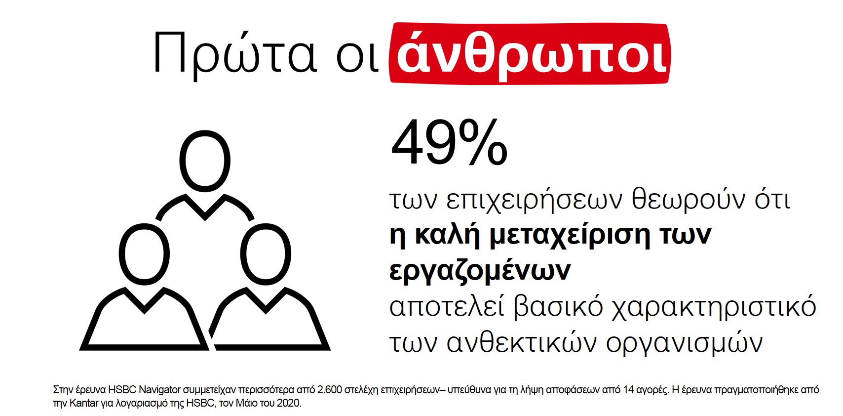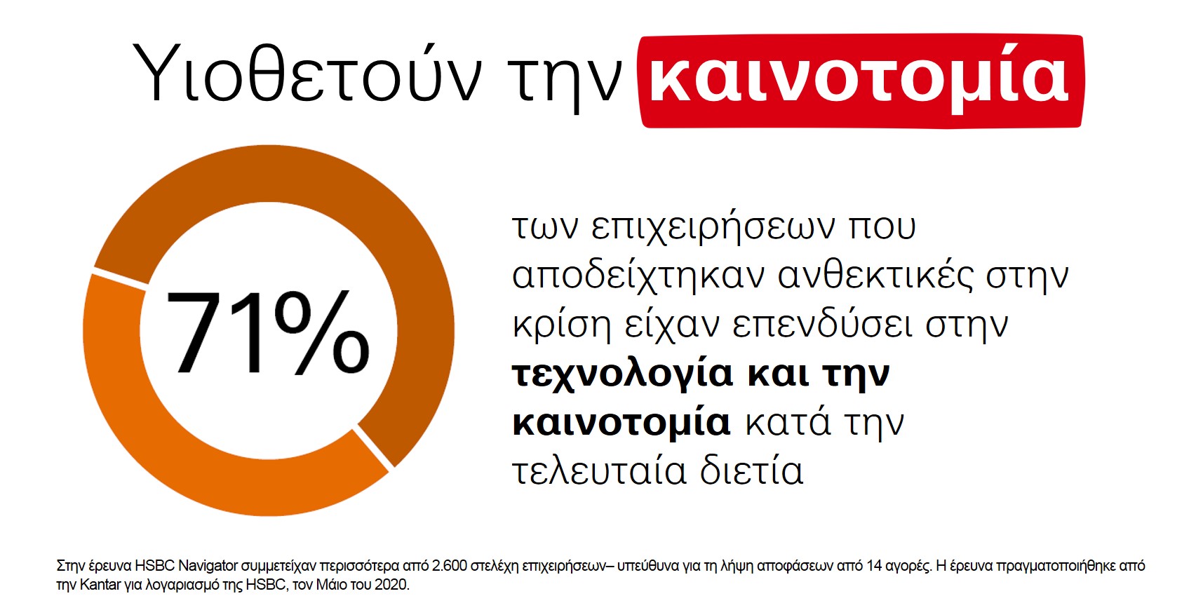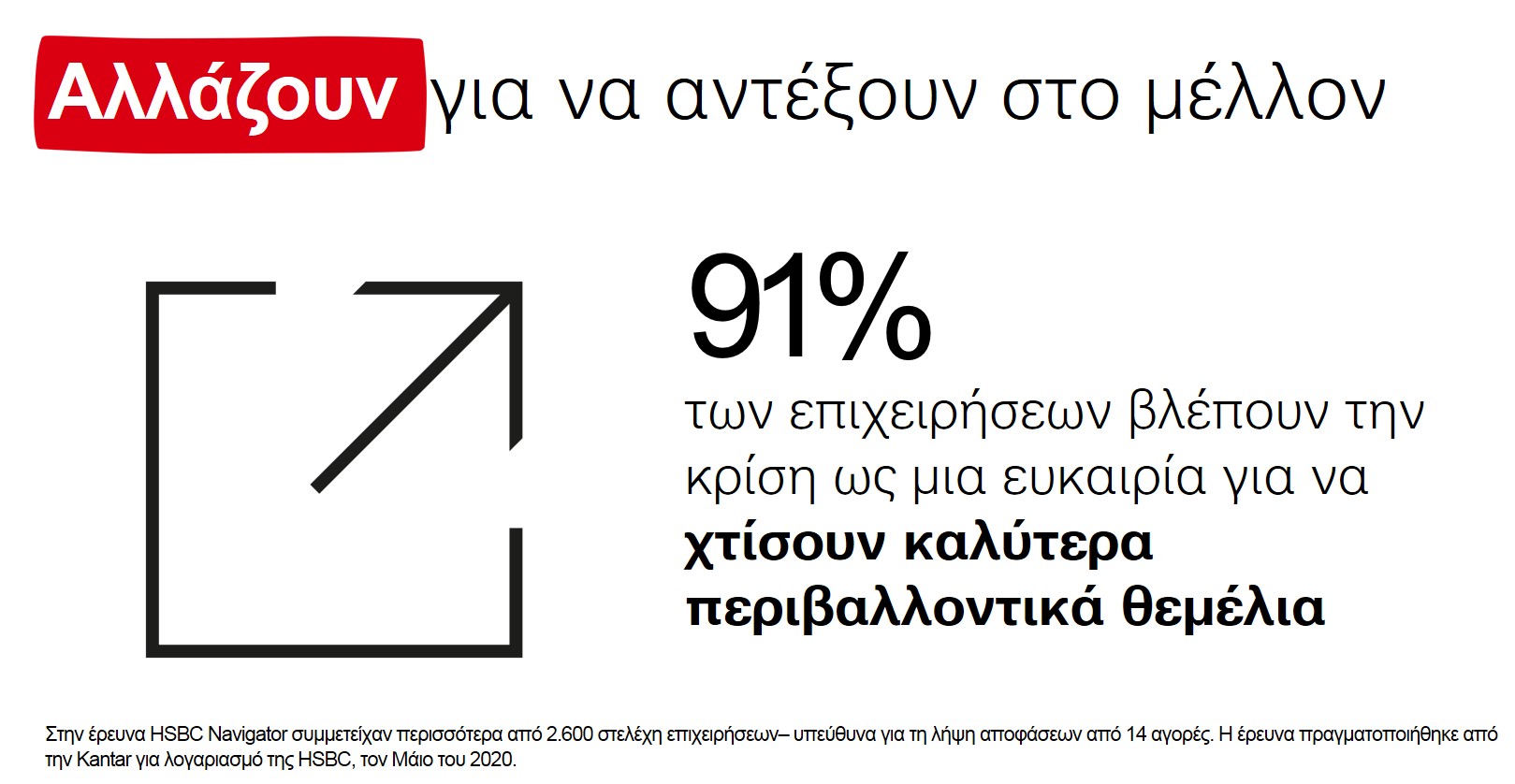 Η φετινή μελέτη του τομέα Επιχειρηματικής Τραπεζικής της HSBC “HSBC Navigator” με τίτλο “Building Back Better”, βασίζεται σε έρευνα στην οποία συμμετείχαν περισσότερες από 2.600 εταιρείες από 14 χώρες και γεωγραφικές περιφέρειες. Η έρευνα δείχνει ότι πολλές επιχειρήσεις παραμέλησαν τον προγραμματισμό έκτακτης ανάγκης σε βασικούς τομείς όπως η τεχνολογία, τα χρηματοοικονομικά και η βιωσιμότητα πριν την κρίση. Μάλιστα, σχεδόν οι μισές (47%) υποστηρίζουν ότι θα μπορούσαν να έχουν κάνει περισσότερα για να προετοιμαστούν για τις προκλήσεις που προέκυψαν τους τελευταίους μήνες.