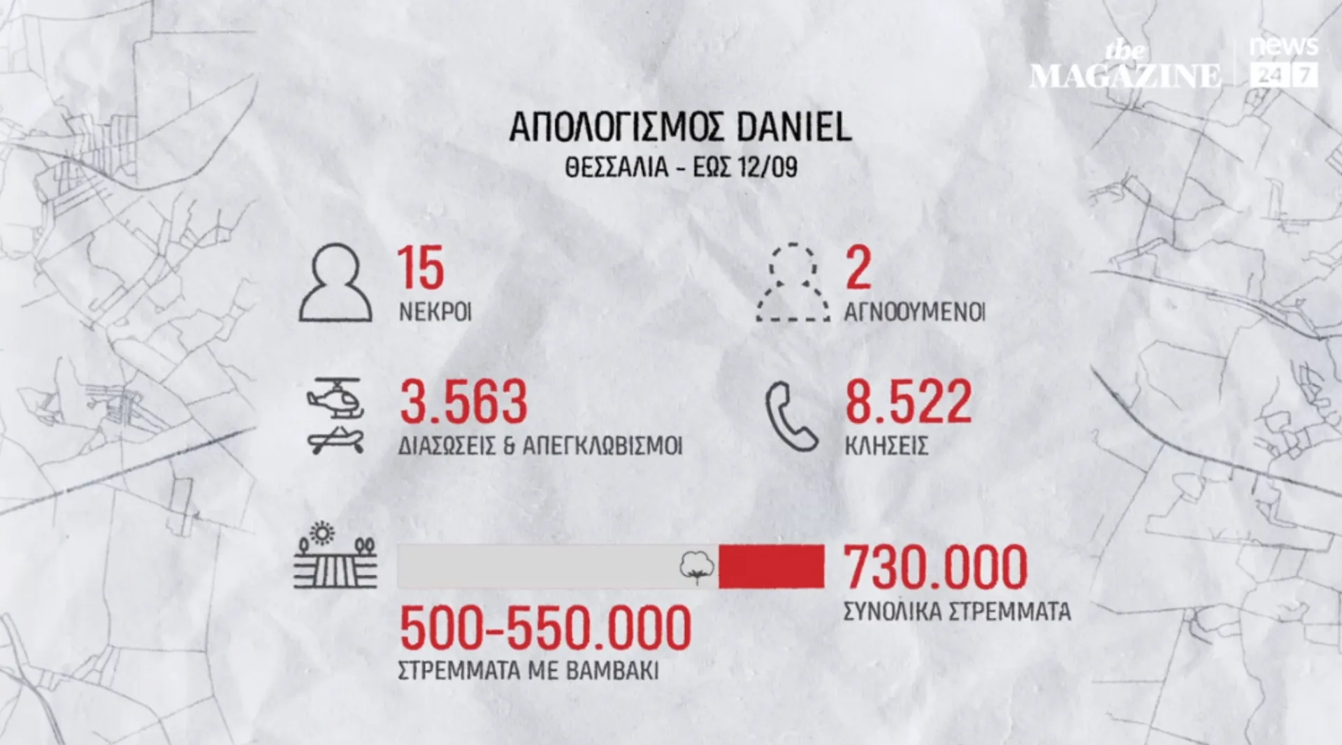 Ο κάμπος της Θεσσαλίας σκεπάστηκε από εκατομμύρια κυβικά νερού. Άνθρωποι έχασαν τη ζωή τους στη λάσπη, άλλοι αγνοούνται ακόμα, κι επίσης καταγράφονται ανυπολόγιστες καταστροφές σε υποδομές, ζωικό κεφάλαιο και αγροτικές καλλιέργειες. Το χτύπημα της κακοκαιρίας Daniel ήταν σφοδρότατο, όμως στον Παλαμά και τα γύρω χωριά η κυβέρνηση έστειλε μήνυμα όταν όλα είχαν τελειώσει. Επιπλέον, η καταστροφή είχε προβλεφθεί με τρομακτική ακρίβεια από τα ίδια αρμόδια υπουργεία. Ποιος έσπασε τα αναχώματα στους παραπόταμους του Πηνειού; Και γιατί, τρία χρόνια μετά το πέρασμα του «Ιανού» δεν υπήρχε στη Θεσσαλία ένα ολοκληρωμένο αντιπλημμυρικό σχέδιο;