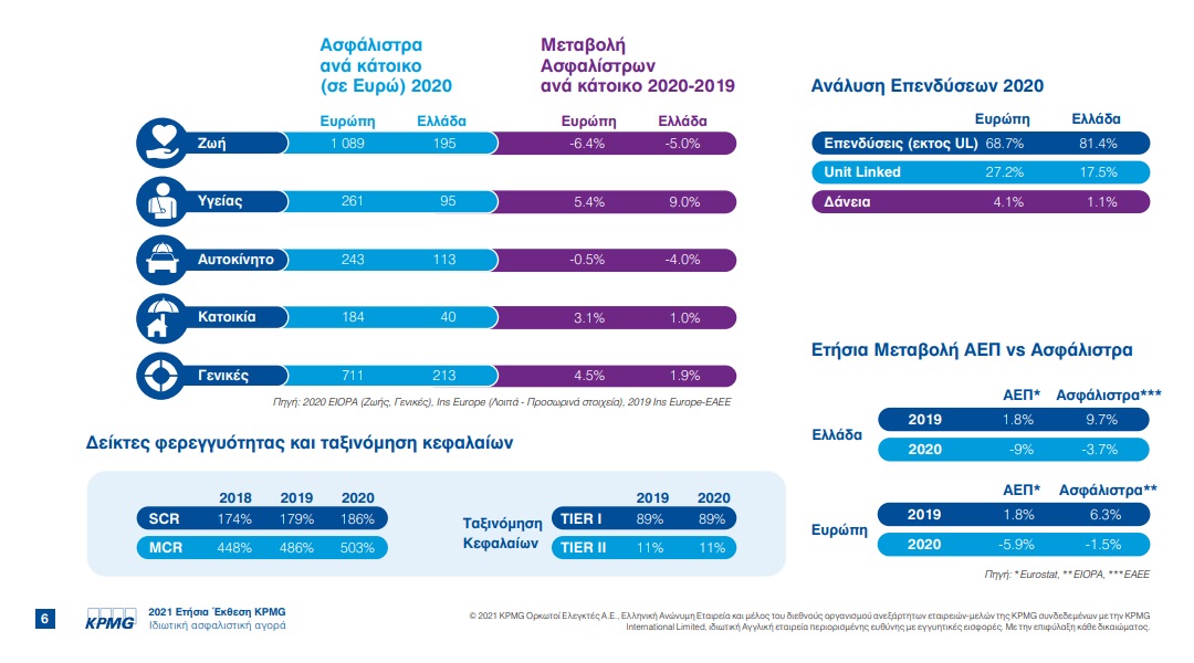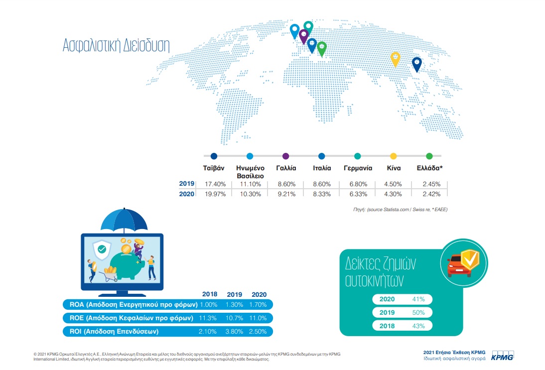 Όπως εξηγεί ο Φίλιππος Κάσσος, Γενικός Διευθυντής στο Τμήμα Ελέγχου της KPMG «θεωρούμε ότι υπήρξε δίκαιη συγκράτηση, του χαμηλού κατά τα άλλα, επιπέδου της ασφαλιστικής παραγωγής το 2020 δεδομένης της πανδημίας του κορωνοϊού που κυριάρχησε στο μεγαλύτερο μέρος τους έτους. Η κερδοφορία για το 2020, αντίθετα ήταν εντυπωσιακή και αξιοσημείωτη. Σε αυτή βοήθησε, η πραγματοποίηση σημαντικών επενδυτικών κερδών από ρευστοποίηση ομολόγων και κυρίως ελληνικών καθώς και η συγκράτηση των λειτουργικών εξόδων των ασφαλιστικών από την εφαρμογή της τηλεργασίας. Επιπλέον, αυτό που έκανε και τη διαφορά στη βελτίωση των λειτουργικών αποτελεσμάτων και αύξηση της κερδοφορίας ήταν αφενός η κάθετη πτώση του δείκτη αποζημιώσεων στο αυτοκίνητο λόγω της μειωμένης κυκλοφορίας αυτοκινήτων, ιδιαίτερα στην πρώτη περίοδο του lockdown και τις ισχνής κίνησης της καλοκαιρινής περιόδου, και αφετέρου της συγκράτησης του νοσοκομειακού κόστους και των δεικτών αποζημιώσεων στους κλάδους υγείας δεδομένου της μειωμένης κίνησης των εισαγωγών στα νοσοκομεία για άλλες αιτίες που καλύπτονται ασφαλιστικά».