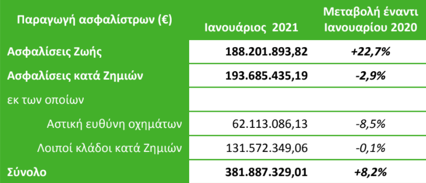 Συνολικά ο κλάδος συγκέντρωσε στις ασφαλίσεις ζωής παραγωγή 188,2 εκατ. ευρώ αυξημένη κατά 22,7% σε σχέση με τον Γενάρη του 2020.