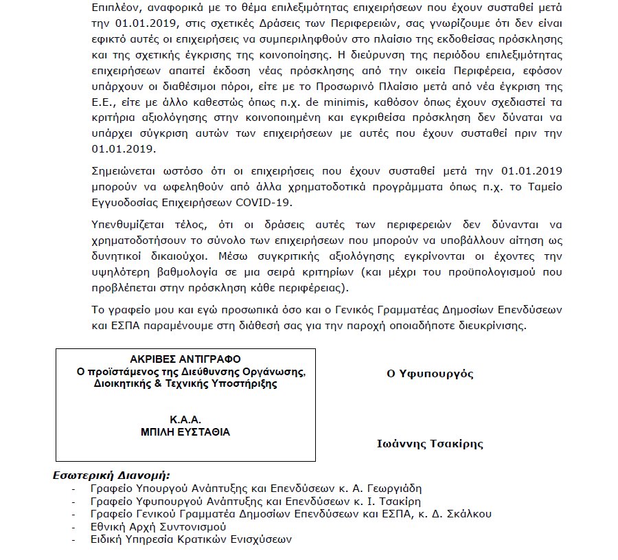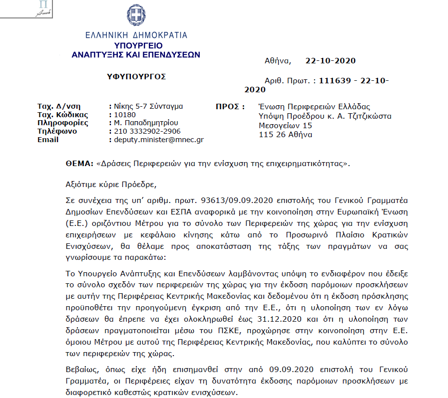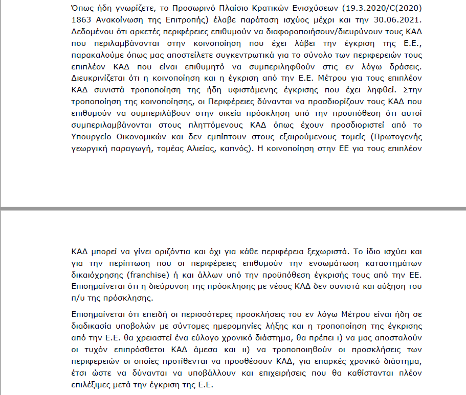 Όπως αναφέρεται στην σχετική επιστολή του Υφυπουργού Ανάπτυξης και Επενδύσεων ζητείται πλέον από τις Περιφέρειες να στείλουν συγκεντρωτικά τους ΚΑΔ που είναι επιθυμητό να συμπεριληφθούν.