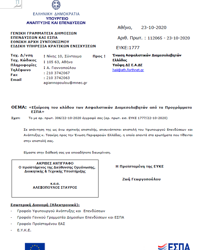 Άμεσα απάντηση από τον Υφυπουργό Ανάπτυξης και Επενδύσεων, Ιωάννη Τσακίρη και την ΕΥΚΕ έλαβε η ΕΑΔΕ σχετικά με την παράλειψη του Κλάδου της διαμεσολάβησης από τις επιδοτήσεις του ΕΣΠΑ.