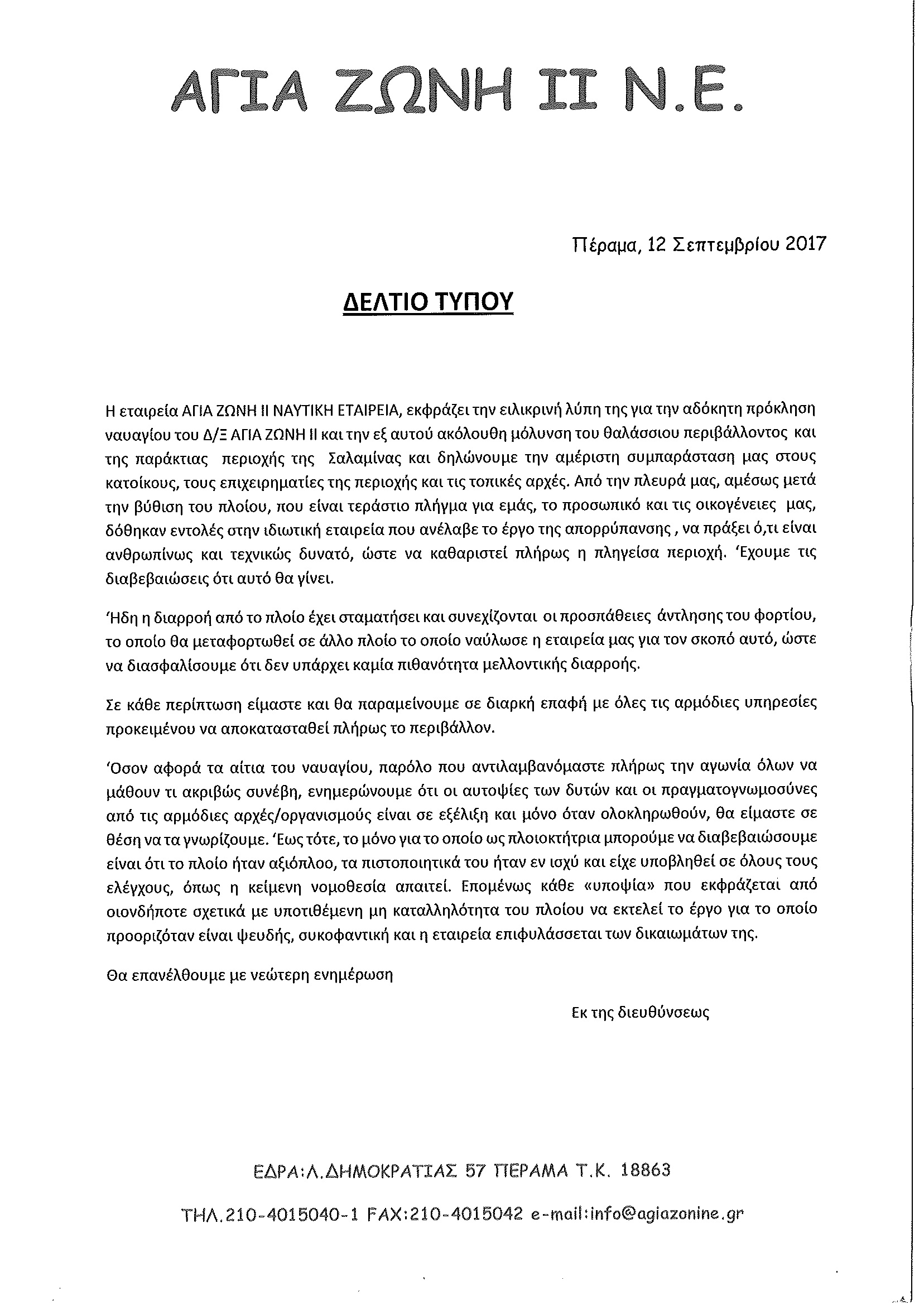 Τεράστια και αναπάντητα ερωτηματικά δημιουργεί η βύθιση του μικρού Δ/Ξ «ΑΓΙΑ ΖΩΝΗ ΙΙ» της Ναυτιλιακής εταιρίας του Θ. Κουντούρη το οποίο ήταν αγκυροβολημένο στο Βόρειο τμήμα του αγκυροβολίου Πειραιά. Το πλοίο απέπλευσε έμφορτο τις πρωινές ώρες της 10/9/2017 από τα διυλιστήρια Ασπροπύργου (ΕΛΠΕ) μεταφέροντας 2.200 μετρικούς τόνους fuel oil και 370 μετρικούς τόνους marine gas oil. Στο πλοίο φέρονται να επέβαιναν 2 μέλη του πληρώματος σε σύνολο 11….. Οι δύο Ναυτικοί που επέβαιναν στο πλοίο διασώθηκαν την τελευταία στιγμή από ρυμουλκό που είχε προσεγγίσει την περιοχή βύθισης του πλοίου.