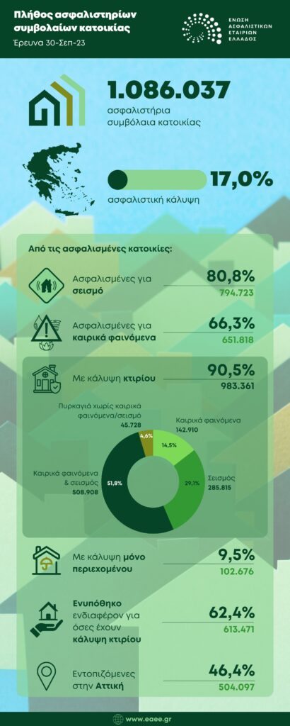 Σε έρευνα της η ΕΑΕΕ συγκέντρωσε στοιχεία για 1.086.037 συμβόλαια ασφάλισης σπιτιών τα οποία ήταν σε ισχύ την 30η Σεπτεμβρίου 2023. Ως εκ τούτου προκύπτει ότι το ποσοστό ασφαλιστικής κάλυψης κατοικιών της χώρας ανέρχεται σε 17%.