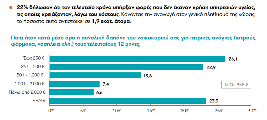 Μάλιστα για το 1/4 αυτών των ανθρώπων, περίπου 495.000, το ποσοστό του πληθυσμού που καταγράφεται δηλαδή και σε ευρωπαϊκές έρευνες να έχει “καταστροφικές δαπάνες υγείας” το ποσό στο οποίο δεν μπορούσαν να ανταποκριθούν σαν δαπάνη ήταν 250 ευρώ.