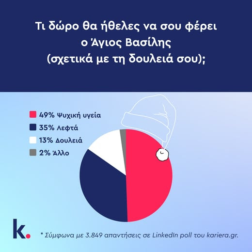 Τέλος, αν ζητούσαν ένα δώρο από τον Άγιο Βασίλη, απαντούν πως θα ήθελαν ψυχική υγεία (49%), αλλά και λεφτά (35%) και δουλειά (13%). (3.849 απαντήσεις συνολικά)