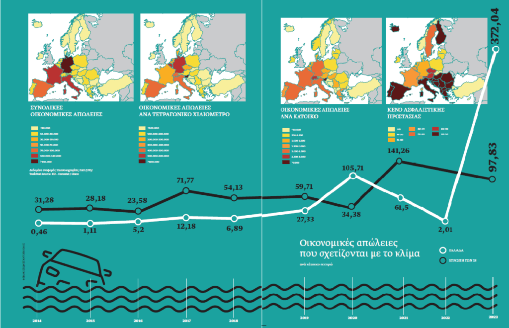 Το 2023 ήταν ένα δύσκολο έτος για την Ελλάδα καθώς ήταν η χρονιά του Daniel. Η καταστροφή που συντελέστηκε στη Θεσσαλία έφερε την πολιτεία και την τοπική ηγεσία αντιμέτωπη με μία πρωτόγνωρη κατάσταση σε επίπεδο ζημιών και απωλειών. Σύμφωνα με στοιχεία της Eurostat (https://ec.europa.eu/eurostat/de/web/products-eurostat-news/-/ddn-20221024-1) τη χρονιά αυτή η χώρα μας καταγράφει αρνητικό ρεκόρ στις κατά κεφαλήν οικονομικές απώλειες από φυσικές καταστροφές, στο ποσό που αναλογεί δηλαδή σε κάθε κάτοικο στην Ελλάδα για τις απώλειες του έτους. Στην Ελλάδα την περίοδο εκείνη το κόστος των κλιματικών καταστροφών ανά πολίτη είναι 372,04 ευρώ, ποσό τετραπλάσιο από τον ευρωπαϊκό μέσο όρο, που ανήλθε σε 97,83 ευρώ. Μάλιστα η μόνη χώρα που το έτος αυτό έχει μεγαλύτερες απώλειες, με τεράστια διαφορά είναι η Σλοβενία. Η πολύ υψηλή κατά κεφαλήν οικονομική απώλεια για κλιματικές καταστροφές στη Σλοβενία (4.685,3 ευρώ) που επίσης είχε καταστροφικές πλημμύρες, οι οποίες επηρέασαν περίπου τα δύο τρίτα της χώρας οδήγησαν σε δαπάνες €7 δισεκατομμυρίων σε ορίζοντα πενταετίας για την ανοικοδόμηση και την ενίσχυση της ανθεκτικότητας.