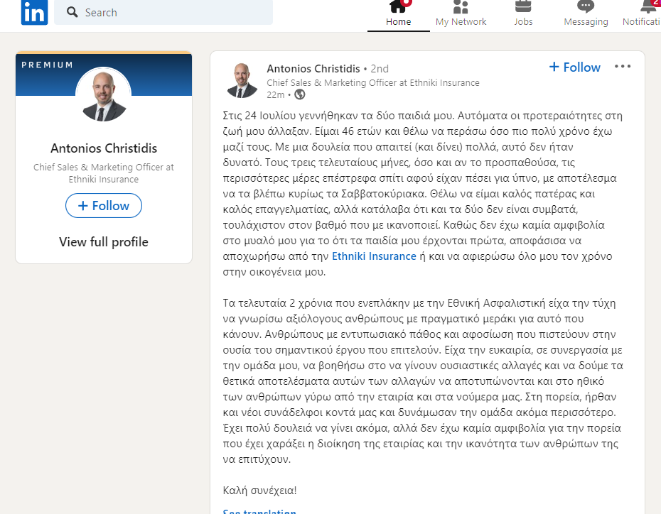 Σε μέσο επαγγελματικής δικτύωσης ανάρτησε ο Αντώνης Χρηστίδης, μέχρι πρότινος διευθυντής πωλήσεων της Εθνικής Ασφαλιστικής μήνυμα για την αποχώρησή του: