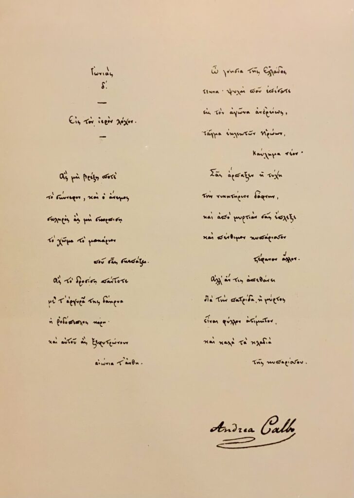 Ο ξεχωριστός εκφραστής αυτής της ποίησης Ανδρέας Κάλβος, όπως και οι ποιητές του 19ου αιώνα άλλωστε, δεν βρήκε το όχημα της μελοποίησης και τραγουδοποιϊας για να καταστεί οικείος στη σύγχρονη Ελλάδα, όπως οι ποιητές του 20ού αιώνα από τη σπουδαία γενιά του 1930 και εντεύθεν. Η γλωσσική ιδιαιτερότητα αλλά και η ρυθμολογία – μετρική και υφολογία της ποίησης του Κάλβου δεν προσφέρονταν εύκολα για τραγούδι.