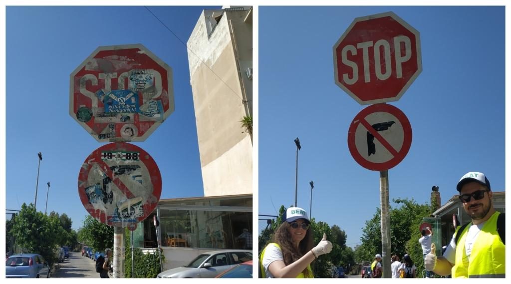 Συγκεκριμένα, οι 40 εθελοντές χωρίστηκαν σε 4 ομάδες και έχοντας μαζί τους τα απαραίτητα υλικά προχώρησαν στον καθαρισμό των πινακίδων στις οδούς περιμετρικά του Παναθηναϊκού Γηπέδου, του Νοσοκομείου Έλενα, γύρω από το 2ο Πειραματικό Γυμνάσιο και Λύκειο, στις οδούς Σούτσου και Τσόχα και έφτασαν μέχρι την Πλατεία Μαβίλη. Παρόλο που πολλές πινακίδες ήταν εντελώς καλυμμένες από αυτοκόλλητα, σε σημείο που να μη μπορεί κανείς να διακρίνει απολύτως τίποτε από τη σήμανση, οι εθελοντές δεν έχασαν το κουράγιο τους και τον ενθουσιασμό τους. Ταυτόχρονα, κατέγραψαν τα συνολικότερα προβλήματα που συνάντησαν στο δρόμο τους (ξηλωμένες και γερμένες πινακίδες, σήματα όχι καλά βιδωμένα, κλαδιά δέντρων που κρύβουν τη σήμανση, κλπ.), τα οποία θα αποσταλούν σε όλους τους αρμόδιους φορείς.