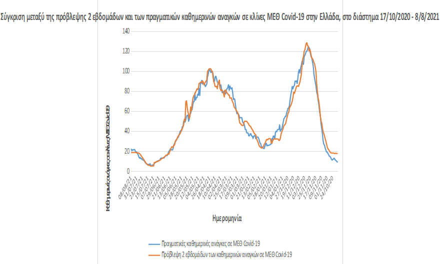 Σχήμα 1. Σύγκριση των προβλέψεων των καθημερινών αναγκών σε κλίνες ΜΕΘ Covid-19 με τα πραγματικά επιδημιολογικά στοιχεία που δόθηκαν δημοσίως μέσα σε διάστημα 10 μηνών (17/10/2020 με 8/8/2021), περιλαμβανομένων και των δύο μεγάλων κυμάτων της πανδημίας.