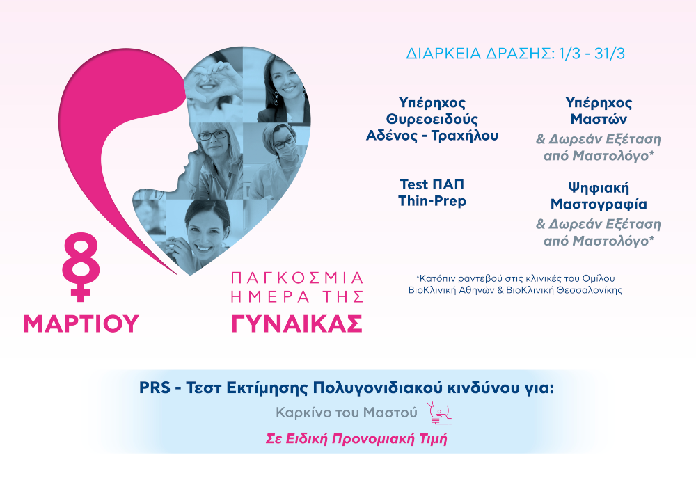 Παράλληλα, προσφέρεται σε ειδική τιμή το τεστ Εκτίμησης Πολυγονιδιακού Κινδύνου για Καρκίνο του Μαστού, από το Κέντρο Προληπτικής Ιατρικής και Μακροβιότητας του Ομίλου ΒΙΟΙΑΤΡΙΚΗ, το οποίο παρέχει για πρώτη φορά στην Ελλάδα, τη δυνατότητα διενέργειας του τεστ Εκτίμησης Πολυγονιδιακού Κινδύνου, PRS (Polygenic Risk Score) για 7 χρόνιες ασθένειες.
