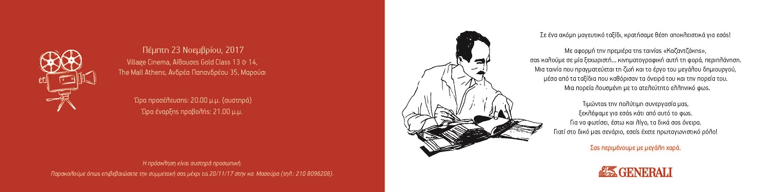 Άνθρωπος ανήσυχος και ανατρεπτικός, ο ασυμβίβαστος Νίκος Καζαντζάκης, ίσως ο πιο πολυδιαβασμένος Έλληνας συγγραφέας, θα αποτελεί πάντα, με το έργο του, σημείο αναφοράς, αλλά και το πιο λαμπρό παράδειγμα της προσπάθειας του ανθρώπου για το καλύτερο. Δεν είναι, λοιπόν, τυχαία η επιλογή της συγκεκριμένης ταινίας, ως αφορμή για το κάλεσμά της Generali. Με αυτόν τον τρόπο θέλησε να ευχαριστήσει τους συνεργάτες της για το πολύτιμο έργο τους, αλλά και να στείλει ένα μήνυμα αισιοδοξίας, μαχητικότητας και δύναμης.