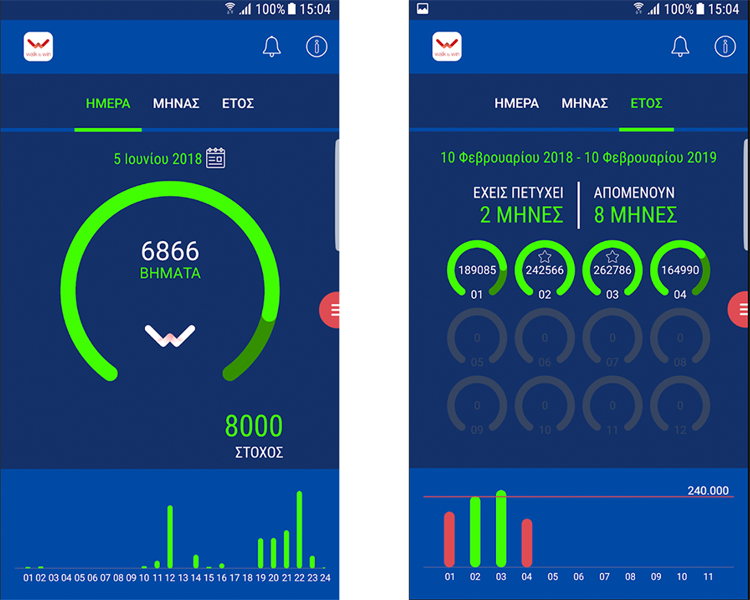 Η νέα εφαρμογή Walk to Win της Eurolife ERB όχι μόνο καταγράφει τα βήματά σας, μέσω του συγχρονισμού της εφαρμογής με τα built-in apps των smartphones, αλλά σας βοηθά να επιτύχετε τους στόχους σας μέσω της παροχής συγκεκριμένων κινήτρων. Το Walk to Win είναι η μόνη εφαρμογή στην Ελλάδα η οποία συνδέει το ασφαλιστήριο πρόγραμμα υγείας σας με την επίτευξη του στόχου των βημάτων σας, επιβραβεύοντας του συνεπείς με επιστροφές ασφαλίστρων και διάφορα άλλα δώρα που σχετίζονται με την υγεία και ευεξία. Στην αρχική σελίδα της εφαρμογής μπορείτε να βλέπετε την ημερήσια επίδοσή σας και το πόσο κοντά βρίσκεστε στον στόχο σας. Κάνοντας slide δεξιά, μπορείτε να παρακολουθείτε την επίδοσή σας σε μηνιαίο και ετήσιο επίπεδο.