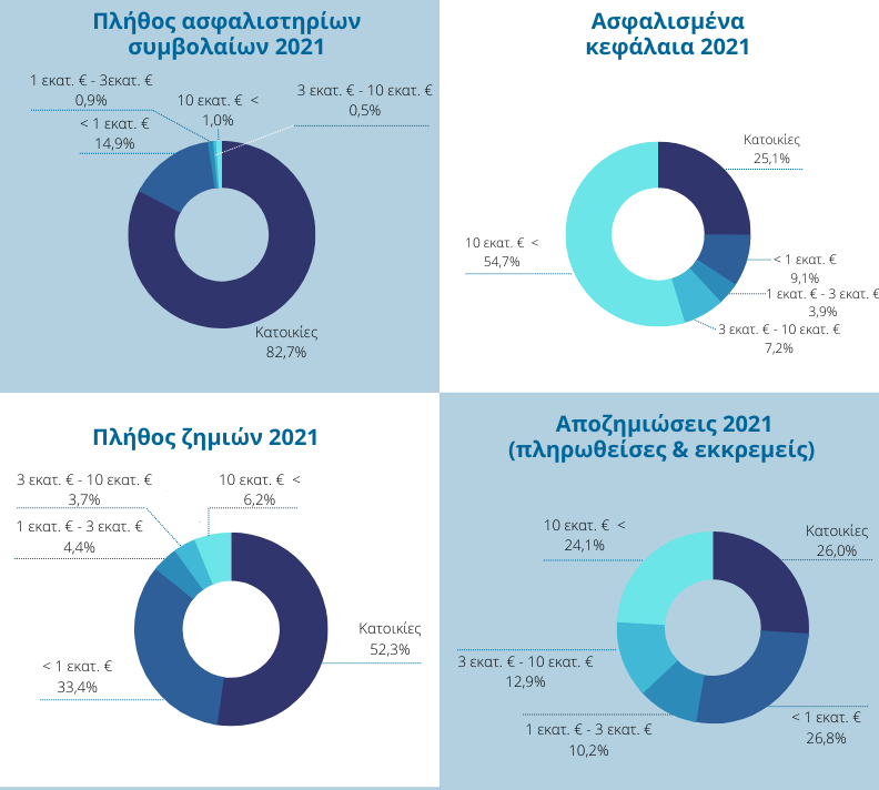 Πιο συγκεκριμένα, εκδόθηκαν 1,3 εκατ. συμβόλαια Ασφάλισης Περιουσίας το 2021, η μεγάλη πλειοψηφία των οποίων (1 εκατ. ή 82,7%) αφορούσε κατοικίες. Για τα συμβόλαια αυτά δηλώθηκαν 15.802 ζημιές εντός του 2021, πληρώθηκαν αποζημιώσεις €34,7 εκατ. αποζημιώσεις και σχηματίστηκε απόθεμα εκκρεμών αποζημιώσεων ύψους €75,8 εκατ.