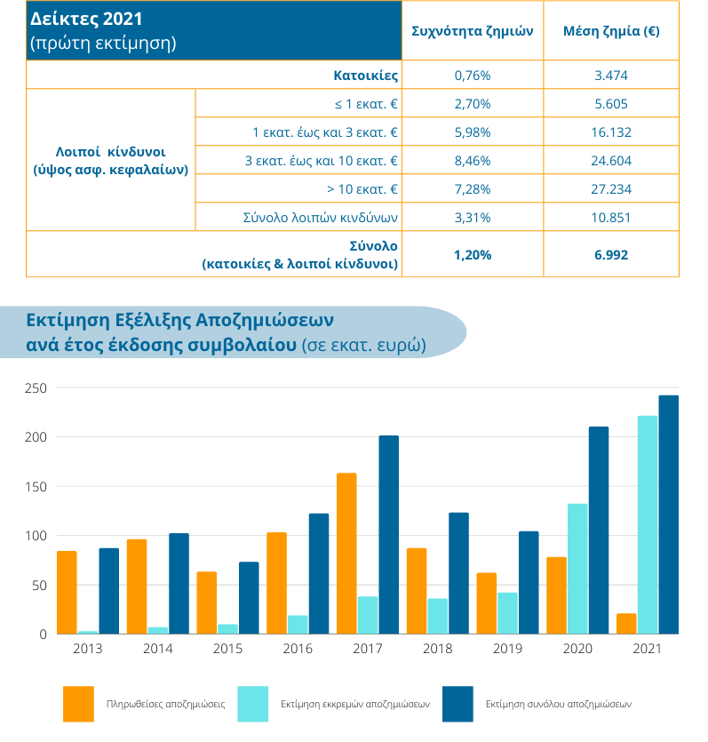Με δεδομένο ότι, οι αποζημιώσεις για ζημιές που συνέβησαν εντός του 2021 στα συμβόλαια που εκδόθηκαν το 2021, εκτιμάται σε €110 εκατ., ενώ μεγάλο μέρος των συμβολαίων ήταν ακόμα σε ισχύ κατά την 31η Δεκεμβρίου, οι αποζημιώσεις που τελικά θα καταβάλει η ελληνική ασφαλιστική αγορά για αυτά τα συμβόλαια, θα είναι σημαντικά υψηλότερες, όπως προέκυψε από την έρευνα που πραγματοποίησε η Ένωση Ασφαλιστικών Εταιριών Ελλάδος (ΕΑΕΕ) για τις Ασφαλίσεις Περιουσίας, έτους 2021, η οποία και θα επικαιροποιηθεί τον επόμενο χρόνο.