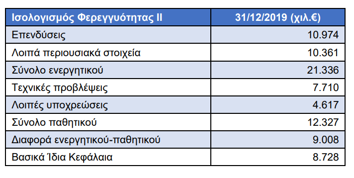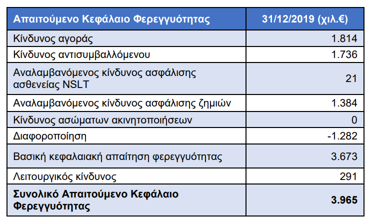 Όπως αναφέρεται στην έκθεση “η Κεφαλαιακή Απαίτηση Φερεγγυότητας ανέρχεται σε 3.965 χιλ. € κατά την 31/12/2019 ενώ εξακολουθεί να υπόκειται σε εποπτική αξιολόγηση. Λόγω της φύσης των δραστηριοτήτων της, η Εταιρεία είναι εκτεθειμένη σε ασφαλιστικούς και χρηματοοικονομικούς κινδύνους.