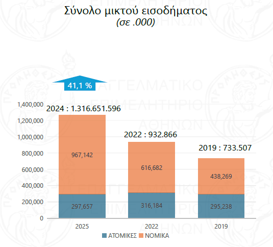 Το 2024 τα νομικά πρόσωπα έχουν συνολικό μικτό εισόδημα 967,1 εκατ. και οι ατομικές επιχειρήσεις 297,6 εκατ. ευρώ, από 438,2 εκατ. ευρώ και 295,2 εκατ. ευρώ αντίστοιχα το 2019.