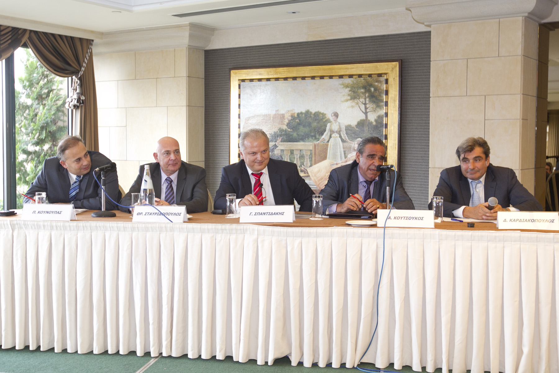 Με μεγάλη επιτυχία ολοκληρώθηκε ο Α` κύκλος ενημερωτικών συζητήσεων για θέματα του Κλάδου Σκαφών μεταξύ των στελεχών της αγοράς και εξειδικευμένων ειδικών/επαγγελματιών (νομικών, πραγματογνωμόνων, αξ/κών Λ.Σ. κ.λπ.) που εμπλέκονται στην πράξη, που διοργάνωσε η Ένωση Ασφαλιστικών Εταιριών Ελλάδος (ΕΑΕΕ) με πρωτοβουλία της Υποεπιτροπής Σκαφών (Hull) της Επιτροπής Μεταφορών & Σκαφών, την Πέμπτη, 11 Οκτωβρίου 2012. Φωτό: Το πάνελ των ομιλητών. Από αριστερά: ο Παναγιώτης Κούνουπας, ο Θρ. Σταυριδόπουλος, ο Γ. Σπαντιδάκης, ο Ανάργυρος Κουτσούκος και ο Δημήτρης Καρδιακόπουλος.