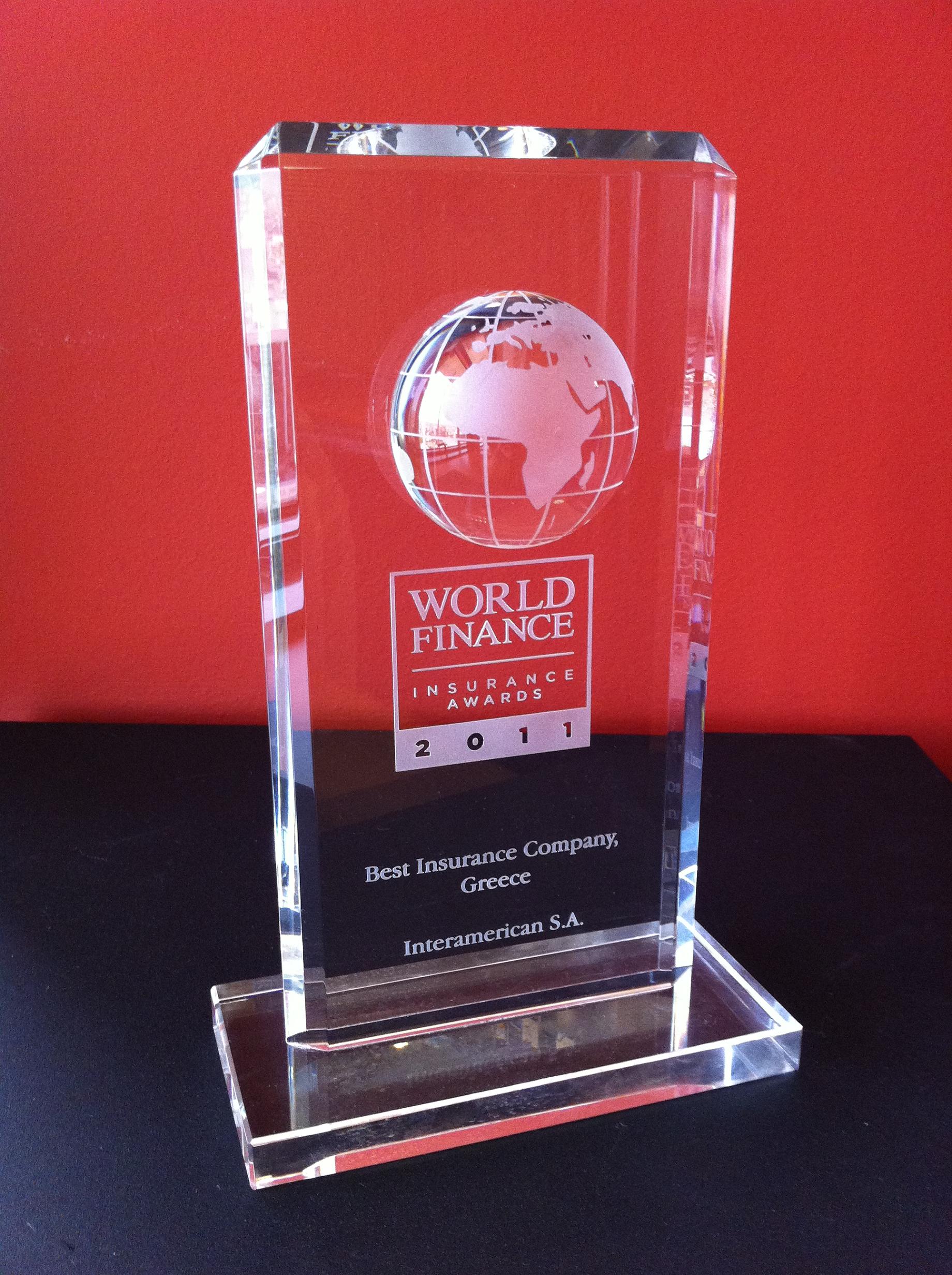 Το διεθνούς κύρους περιοδικού “World Finance” έχει θεσμοθετήσει σε ετήσια βάση ασφαλιστικά βραβεία για τις πλέον διακεκριμένες εταιρείες της παγκόσμιας ασφαλιστικής αγοράς. Όπως το 2010, το περιοδικό συμπεριέλαβε και για το 2011 από την Ελλάδα την Interamerican μεταξύ των κορυφαίων ασφαλιστικών οργανισμών, αναγνωρίζοντας ότι ακολουθεί με συνέπεια τις επίκαιρες τάσεις της αγοράς. Βασικά κριτήρια ήταν η ανάληψη και συνετή διαχείριση κινδύνων με ελαχιστοποίηση της έκθεσης και η εναρμόνιση της εταιρείας με την κοινοτική οδηγία Solvency II, εν όψει της εφαρμογής της, με έμφαση στη δημιουργία αποθεματικών ικανού περιθωρίου φερεγγυότητας. Φωτoγραφία: Το Βραβείο για την Interamerican στα “World Finance Insurance Awards 2011”.