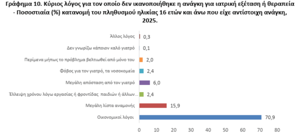 Βασικότερος λόγος που οι Έλληνες δεν έχουν πρόσβαση σε ιατρικές υπηρεσίες που χρειάζονται είναι ο οικονομικός σε ποσοστό 70,9% και εν συνεχεία σε ποσοστό 15,9% λόγω μεγάλης λίστας αναμονής.