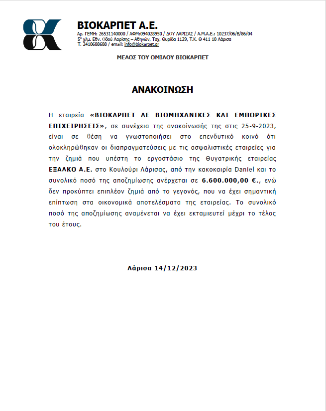 Ολοκληρώθηκε σε σύντομο χρονικό διάστημα ο διακανονισμός για τις ζημιές που είχε υποστεί η EXALCO στη Λάρισα, θυγατρική της ΒΙΟΚΑΡΠΕΤ, από την επέλαση της κακοκαιρίας Daniel με το ποσό της αποζημίωσης να ορίζεται στα 6,6 εκατ. ευρώ.