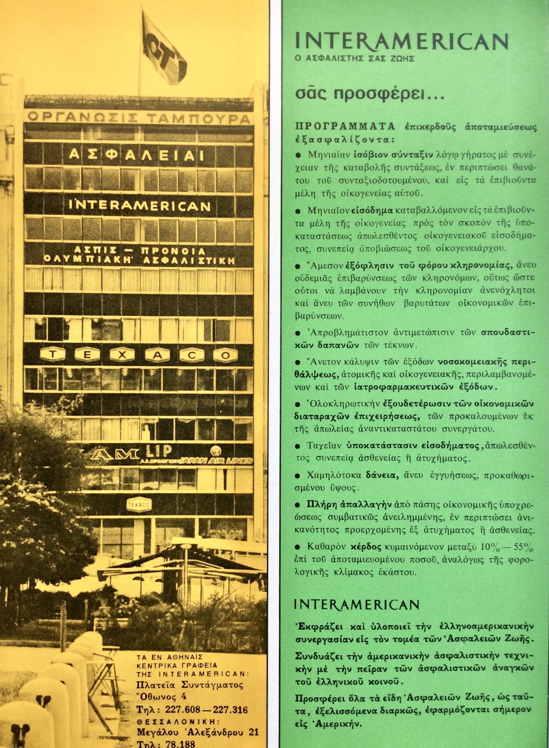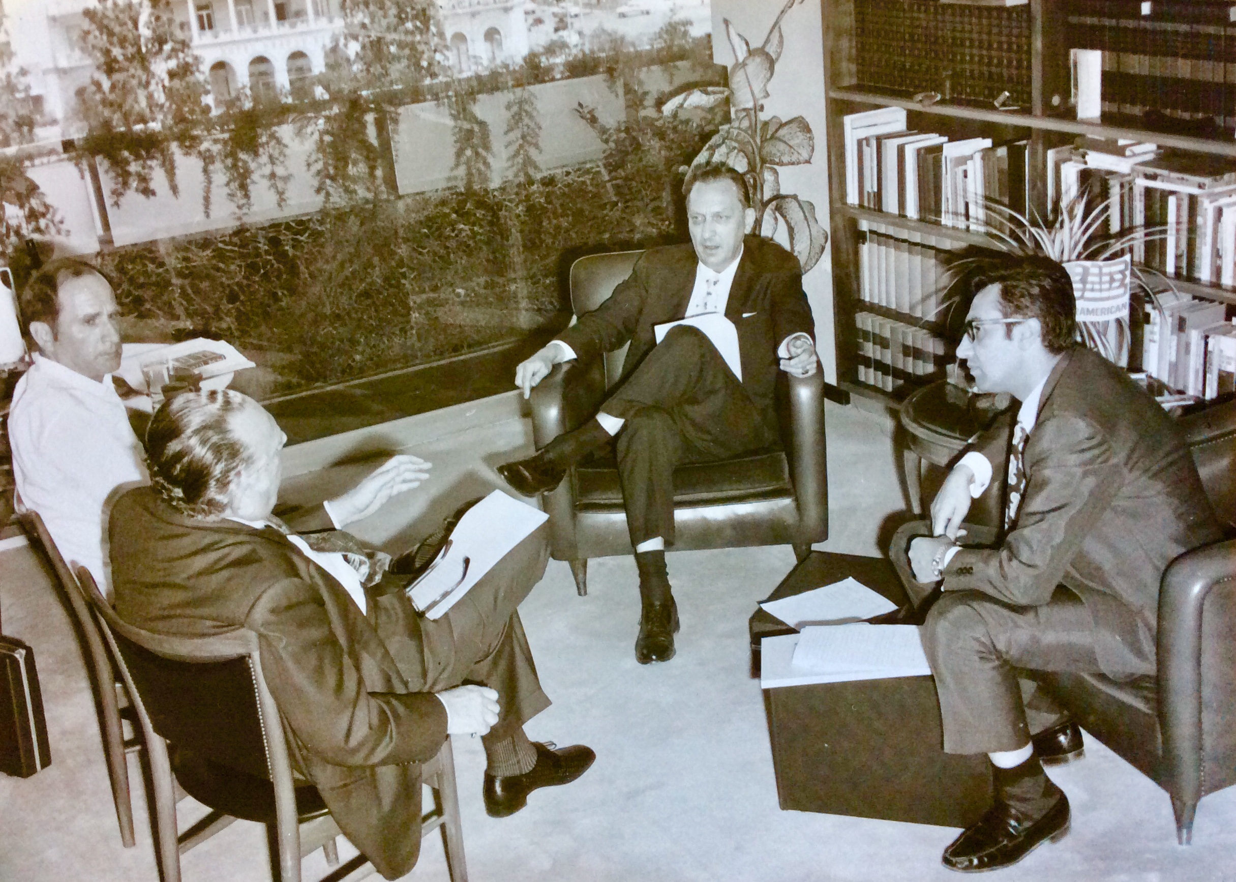 To 1971, οι ιδρυτές της Interamerican Δημήτρης Κοντομηνάς και Αλέξανδρος Ταμπουράς προχώρησαν σε ένα joint venture, εισάγοντας την αμερικανική ασφαλιστική τεχνογνωσία στις ασφαλίσεις Ζωής – και φυσικά ενισχύοντας τα κεφάλαια, με τη μεγάλη τότε αμερικανική εταιρεία INA (Insurance of North America). Η Interamerican, «η πρώτη αμιγώς ασφα- λιστική εταιρεία Ζωής στην Ελλάδα», ταυτόχρονα έγινε Ανώνυμη (είχε ιδρυθεί ως ΕΠΕ τον Φεβρουάριο του 1969). Στο στιγμιότυπο, οι Α. Ταμπουράς, Δ. Κοντομηνάς, ο επικεφαλής των νομικών υπηρεσιών Μ. Κοντομίχαλος και ο R. Anderson εκ μέρους της ΙΝΑ, σε μια από τις προπαρασκευαστικές συζητήσεις της συνεργασίας που μεγάλωσε την Interamerican, στα πρώτα γραφεία της πλατείας Συντάγματος – Όθωνος 4, στο γραφείο του Α. Ταμπουρά.