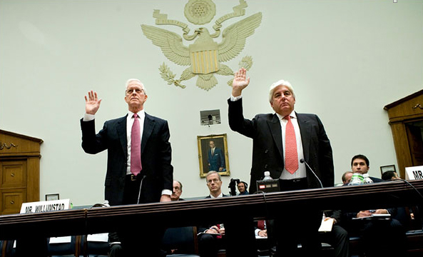 Μία μέρα μετά την ανάκριση του προέδρου της Lehman Bros, Richard S. Fuld Jr. από την αρμόδια Επιτροπή της Βουλής των ΗΠΑ, όπου κλήθηκε να δικαιολογήσει τον τρόπο με τον οποίο απέκτησε την τεράστια περιουσία του, τη θέση του ανακρινόμενου πήραν τη Τρίτη 8/10/08 τα δύο προηγούμενα ανώτατα Στελέχη της AIG τα οποία στην κυριολεξία «τσιγαρίστηκαν» από την ανάκριση. Συγκεκριμένα, οι Βουλευτές επέμεναν να πάρουν απαντήσεις για ποιο λόγο η AIG συνέχισε να ξοδεύει τεράστια ποσά σε ακριβά ταξίδια των συνεργατών της, μετά τη σωτήρια χορηγία των 85 δις της Αμερικανικής Κυβέρνησης!