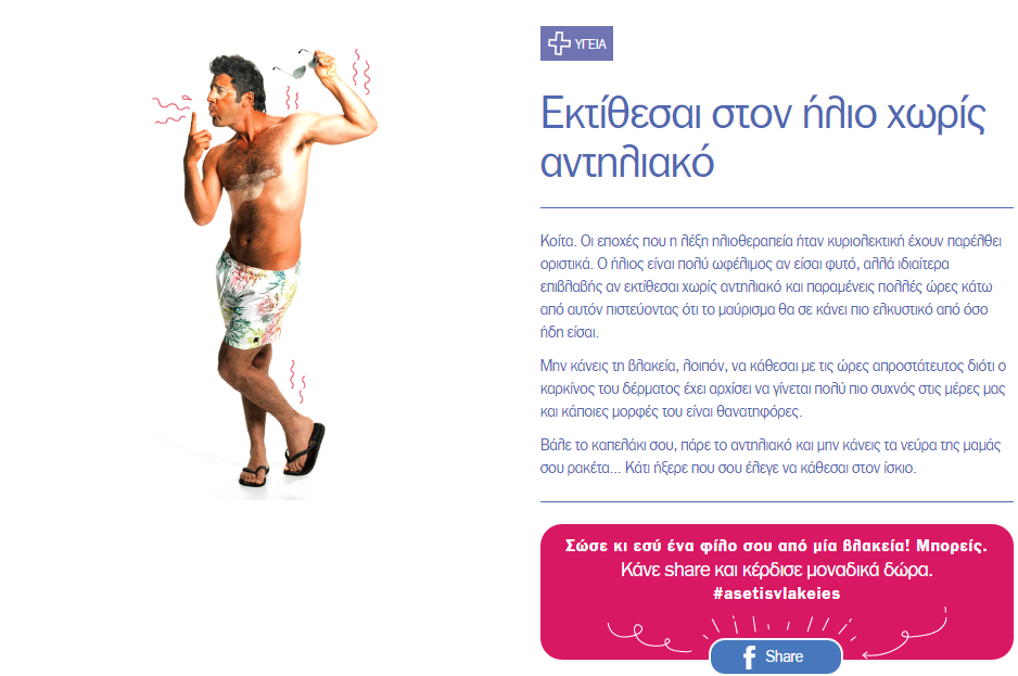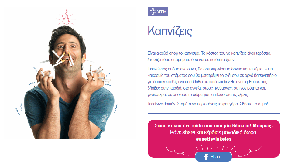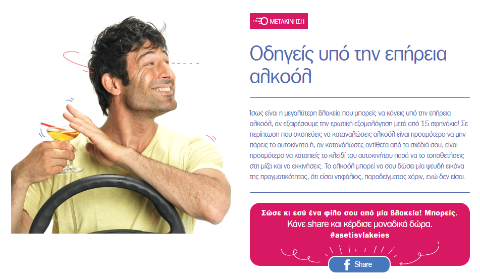 Οι επισκέπτες του asetisvlakeies.gr, αφού ανακαλύψουν ποιες βλακείες κάνουν οι ίδιοι καθημερινά, μπορούν να διαδώσουν το μήνυμα πρόληψης και προστασίας, κάνοντας share το περιεχόμενο της ιστοσελίδα και «σώζοντας» με τον τρόπο αυτό τους φίλους τους από λάθη που κάνουν και εκείνοι. Η σημαντική αυτή κίνηση ανταμείβεται με μία σειρά μοναδικών δώρων προστασίας που θα δοθούν κατόπιν κλήρωσης.